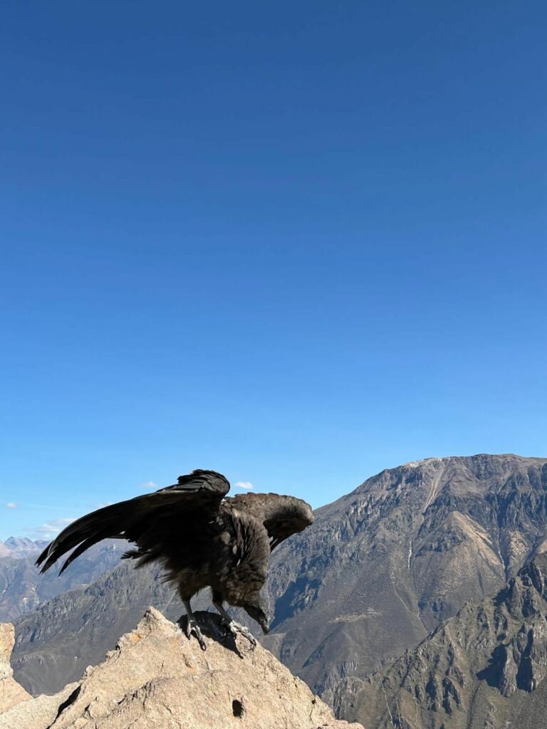 Le Condor des Andes est l’un des plus grands oiseaux volants au monde. Son trait le plus impressionnant est son envergure, qui atteint en moyenne 3 à 3,2 mètres, et peut aller jusqu’à 3,5 mètres. Malgré sa taille et son poids (jusqu’à 15 kg pour les mâles), le condor est un planeur exceptionnel. Il profite des courants thermiques et ascendants du canyon pour s’élever et planer sur de longues distances (jusqu’à 200 km par jour) avec un effort minimal.