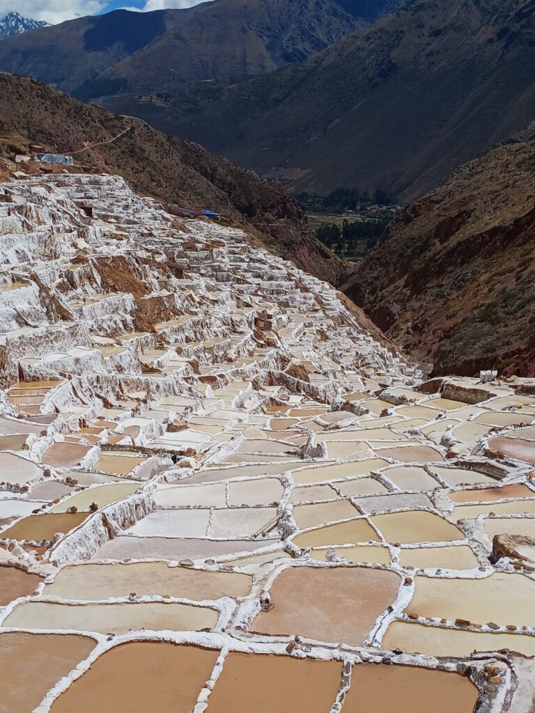 Ensuite vous vous rendez aux salines de Maras : Un spectaculaire réseau de bassins de sel en terrasses, exploité depuis l’époque pré-inca. La vue panoramique de ces milliers de bassins blancs et ocres accrochés à flanc de montagne est unique.